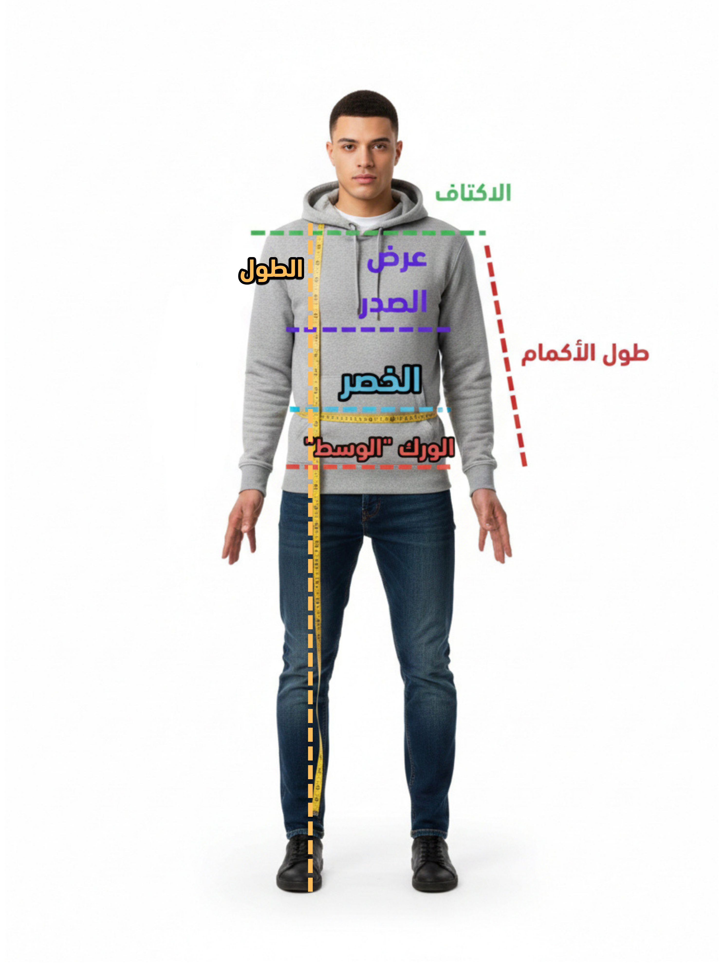 بإتباع هذا الدليل البسيط، ستتمكن من تحديد مقاسك بدقة واختيار التيشيرت، الهودي، أو البنطال المناسب لك وكأنه صُمم خصيصاً لقياساتك.