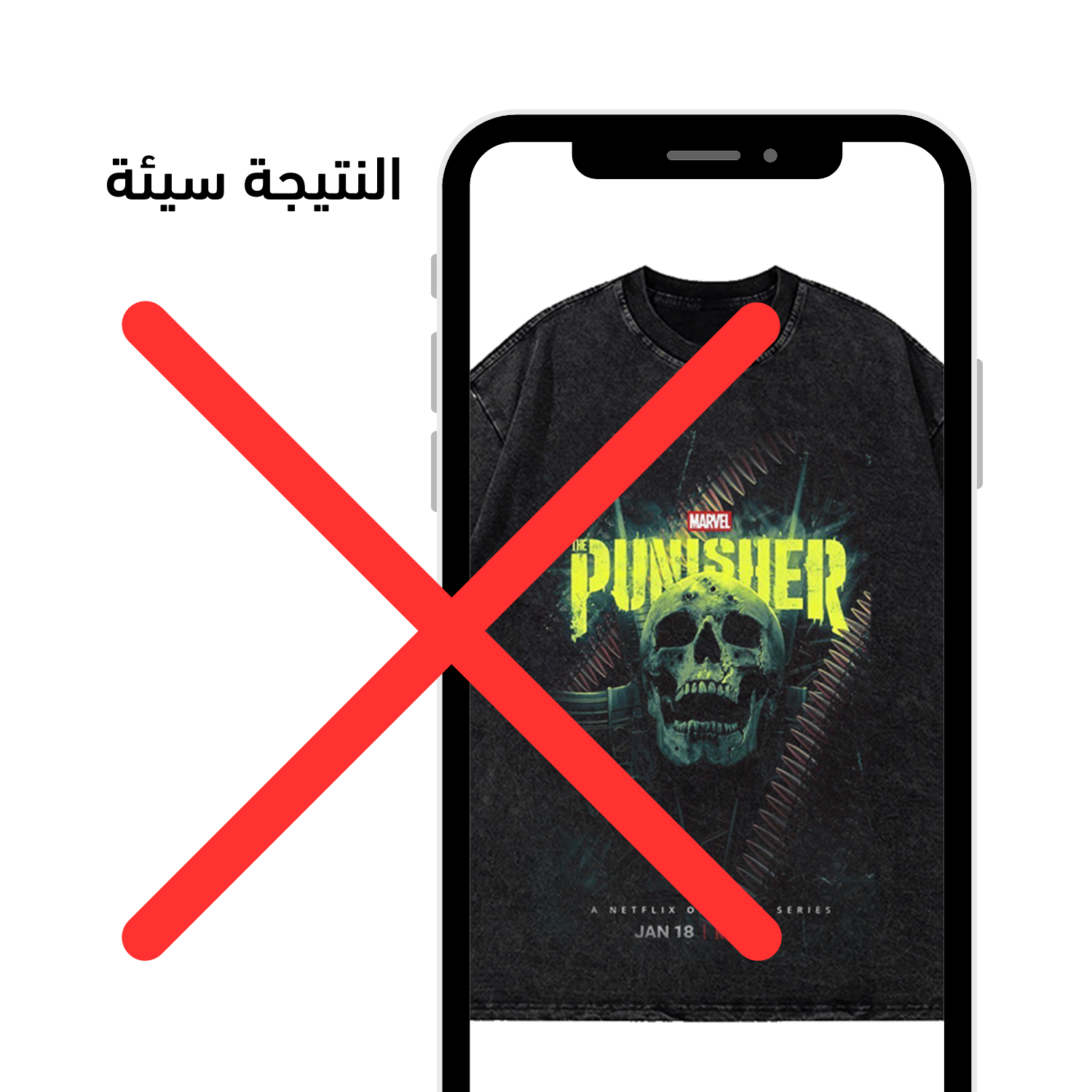 • النتيجة السيئة ❌: إرسال صورة بجودة منخفضة ضعيفة، او صوره مطبوعة بالفعل على تيشيرت، أو مقتطعة، أو موضوعة بمقاس غير متناسق يجعل المظهر العام غير احترافي.
